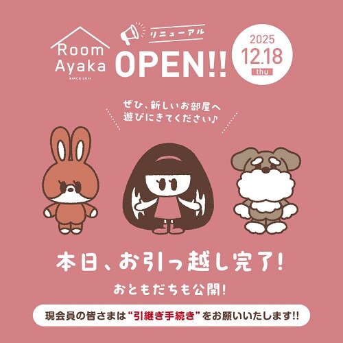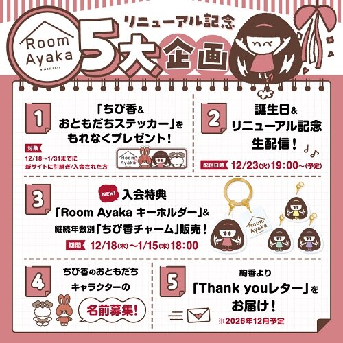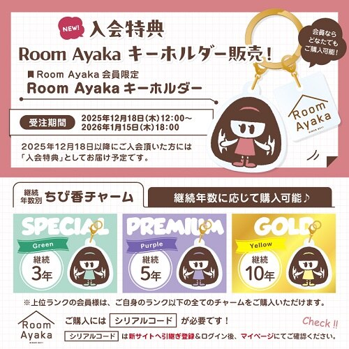 🆕入会特典「Room Ayakaキーホルダー」&継続年数別ちび香チャーム販売!