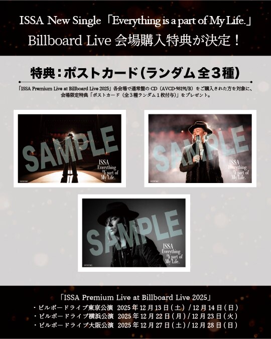 「ISSA Premium Live at Billboard Live 2025」各会場で対象商品をご購入された方を対象に、会場限定特典「ポストカード(全3種ランダム1枚付与)」をプレゼント。