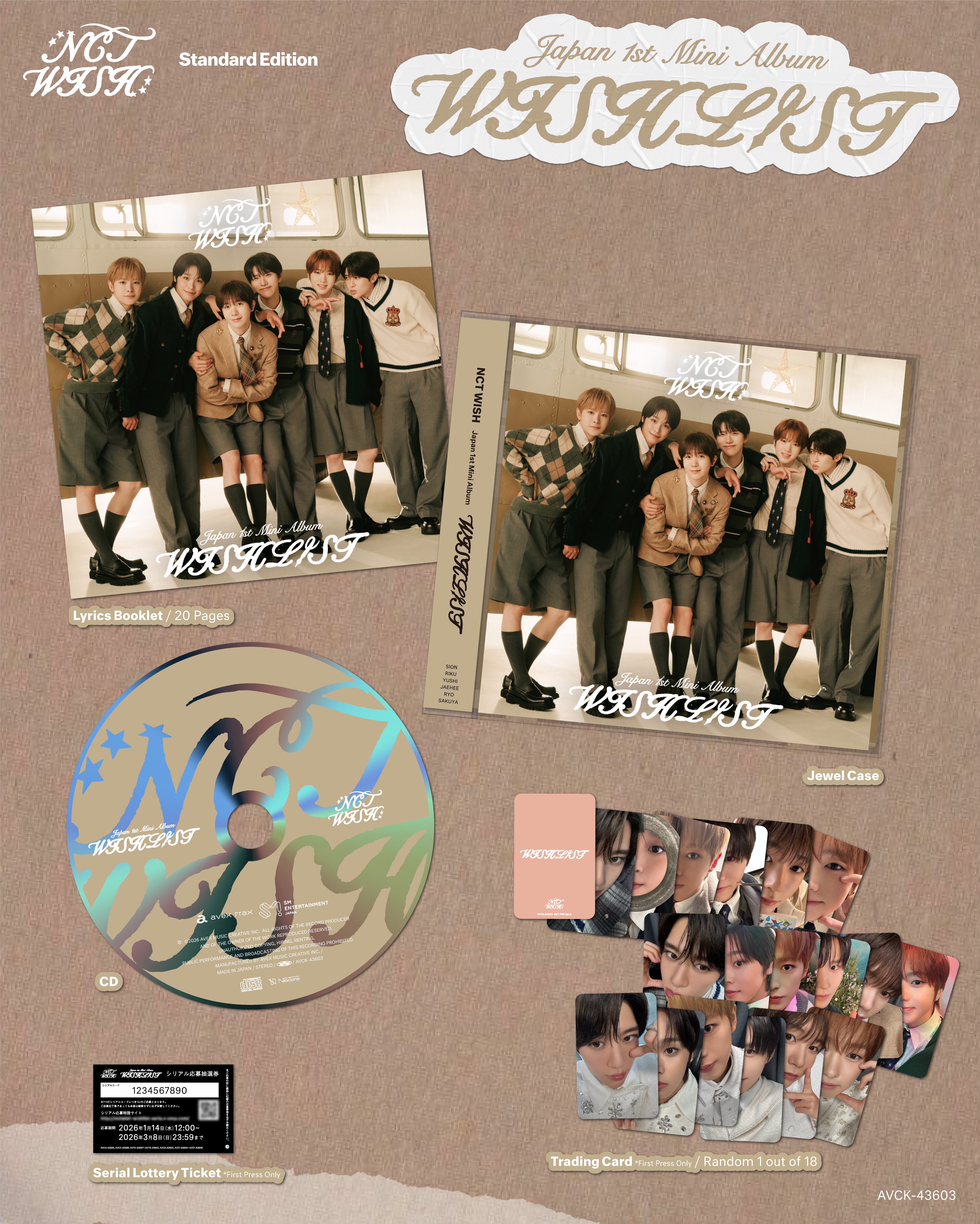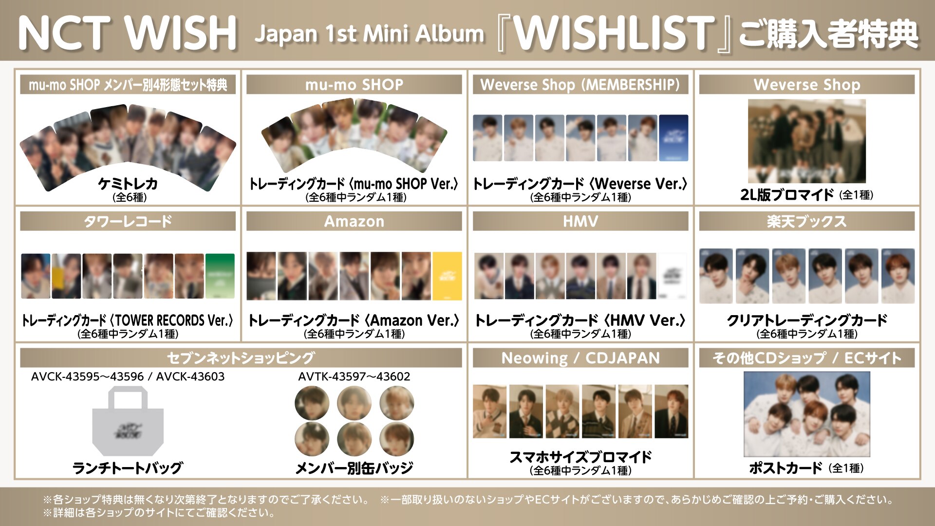 NCT WISH Japan 1st Mini Album『WISHLIST』2026年1月14日(水)リリース決定!<『NCT WISH 1st CONCERT TOUR INTO THE WISH : Our WISH in JAPAN』終演後メンバー全員トレーディングカードお渡し会抽選応募特典付きの販売決定>※10月10日情報更新 <タワーレコード・Amazon・HMV・CDJAPAN限定シリアル応募抽選券付き販売のお知らせ>※11月12日情報更新 <特典会開催日程変更のご案内>※11月25日情報更新 <商品イメージ・各ショップ特典絵柄イメージ公開>※12月26日情報更新