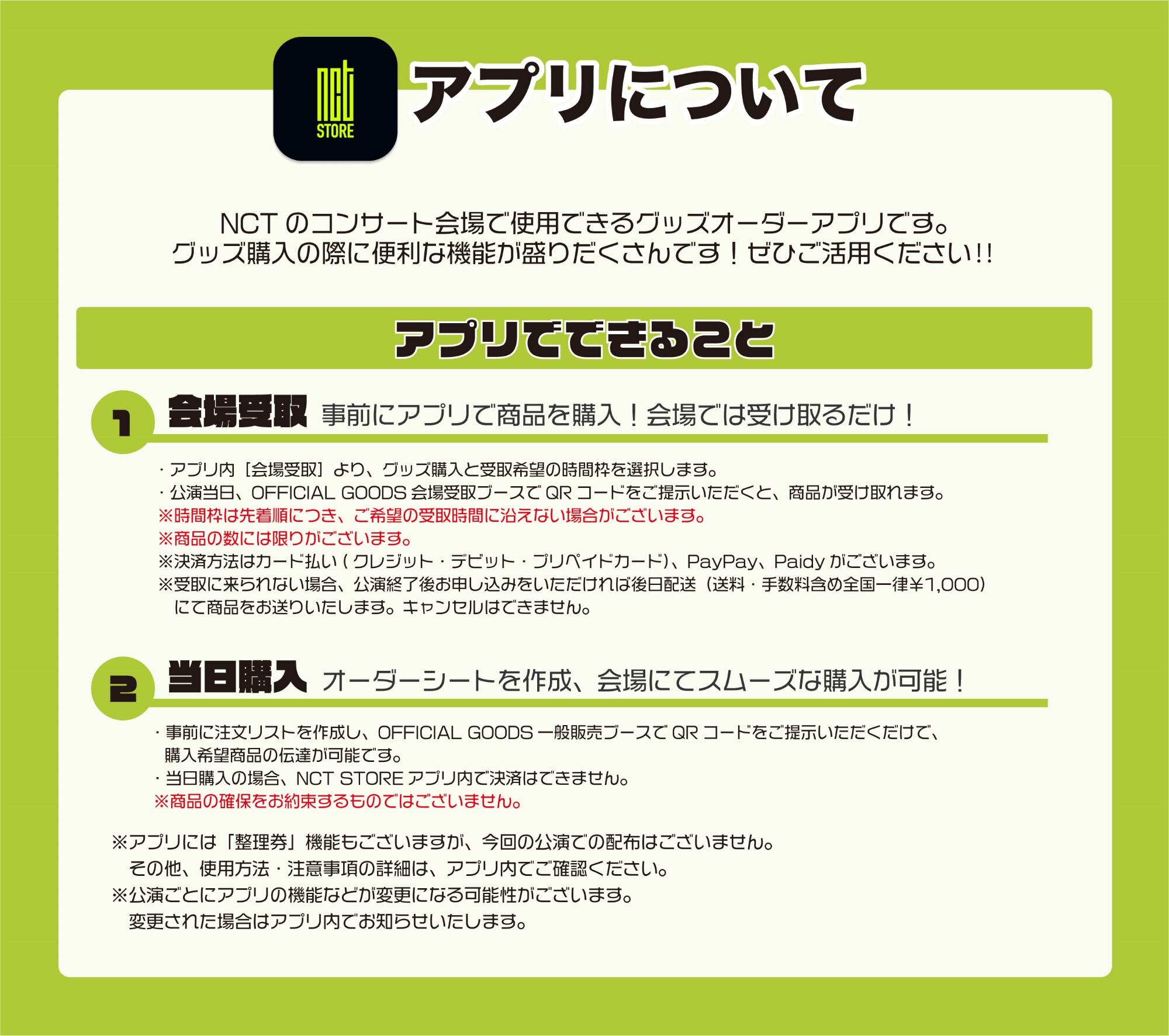※オンラインでご購入された商品は参加される公演までのお届けをお約束することはできかねます。会場にてグッズをご利用予定のお客様は、「NCT STORE」アプリでの「会場受取」か「一般販売」をご利用ください。