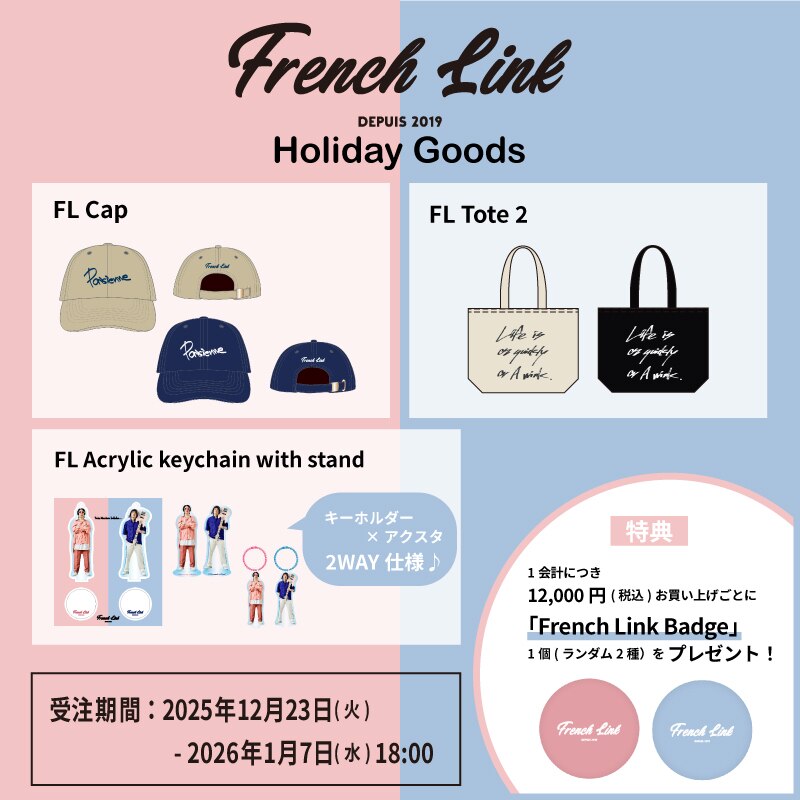 1会計につき12,000円(税込)お買い上げごとに、French Link Badge(ランダム2種)を1個プレゼント!